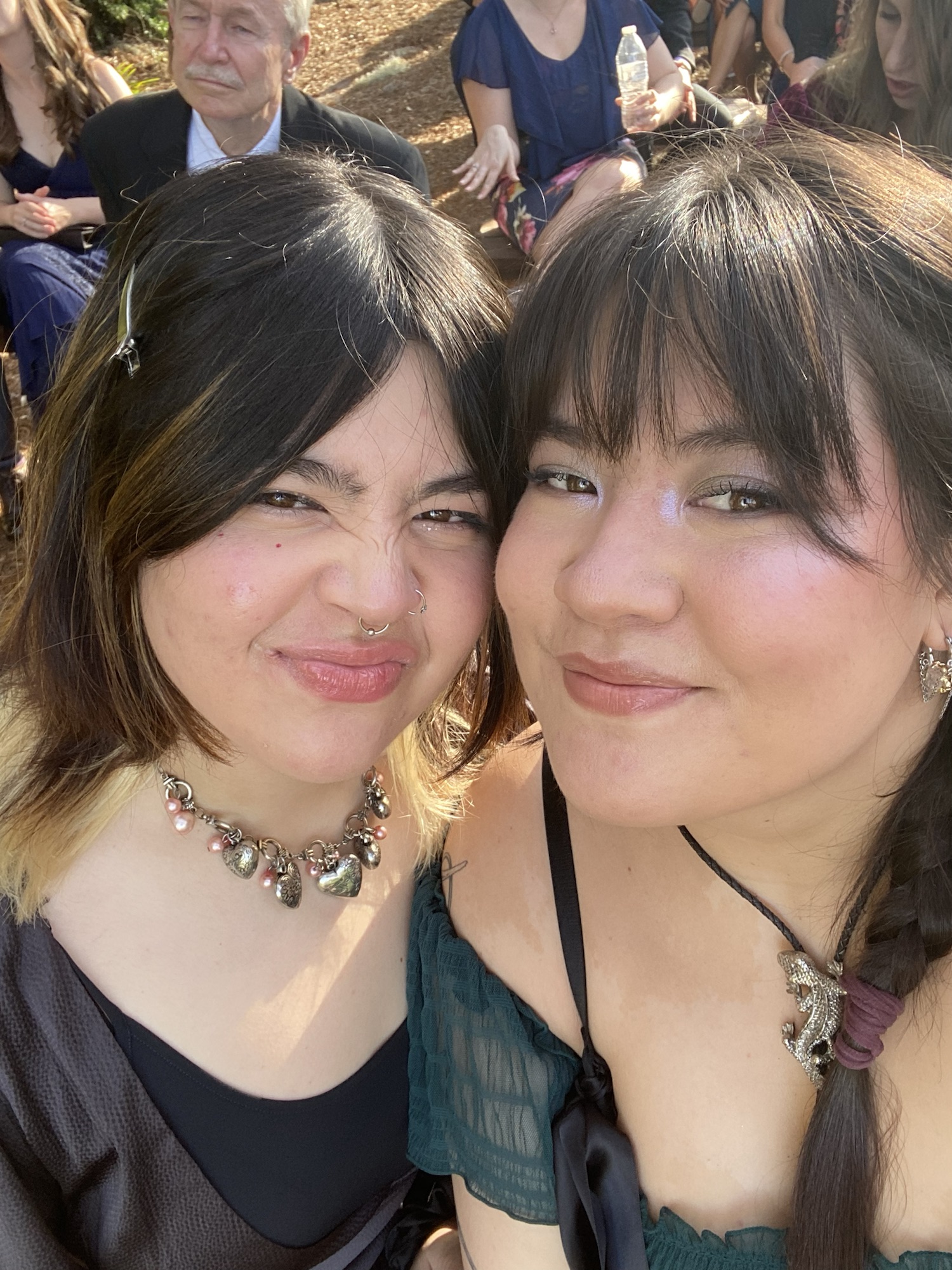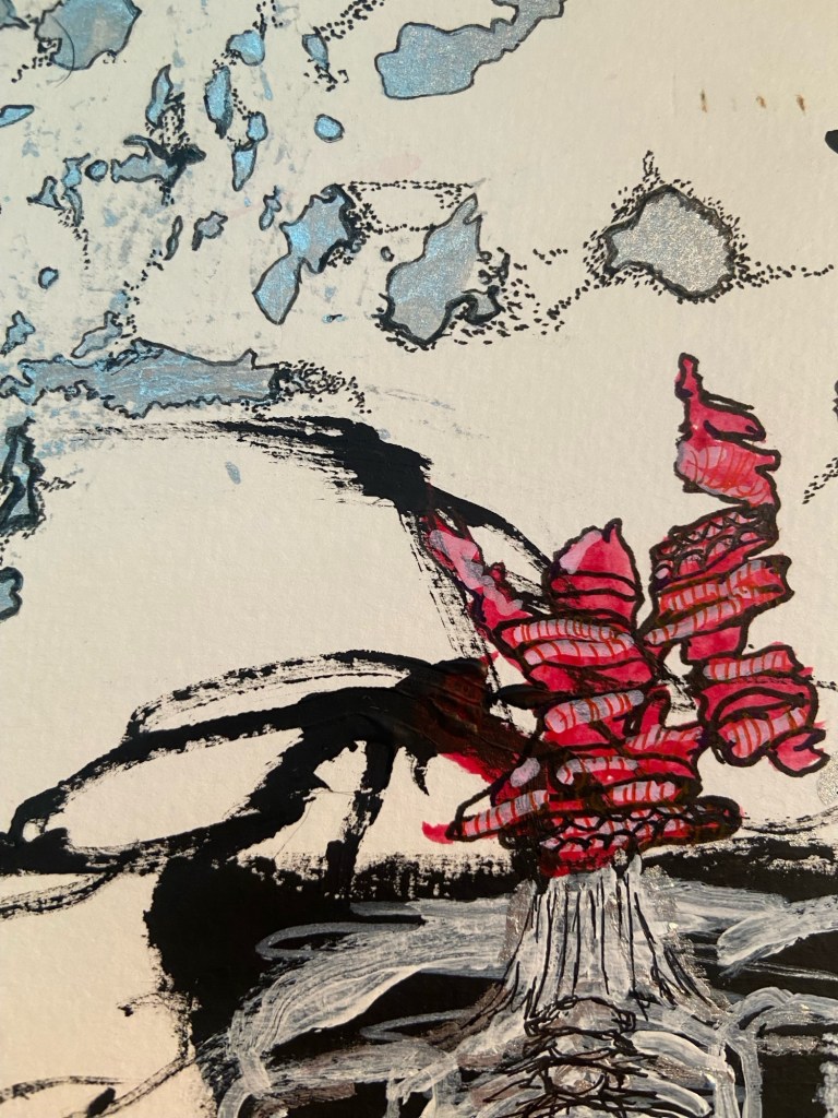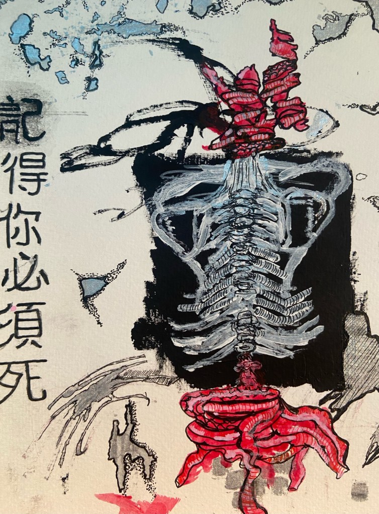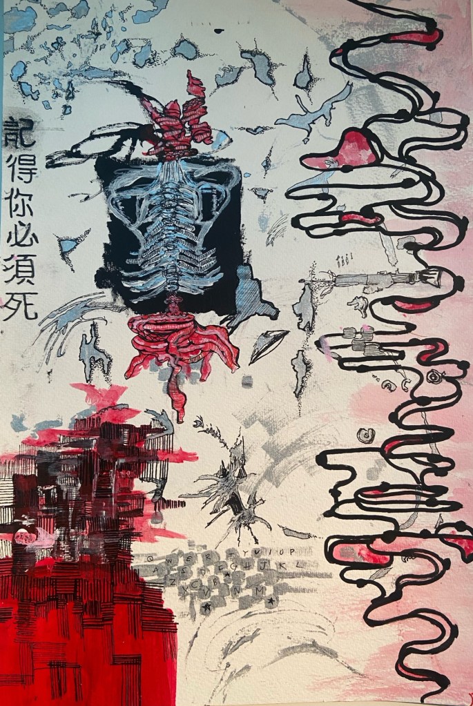 Acrylic paint, Posco pens, black Micron pens, and metallic nail polish brought this work to life. They chose the quote, “Memento Mori” as a jumping off point, directly translating to “remember death” or “remember you must die”, also transcribed in Chinese characters on the left side of the piece. They interpreted this sentiment as a tribute to the inevitability of death, remembering those who have passed in your lifetime, and how they’ve contributed to the development of your character.